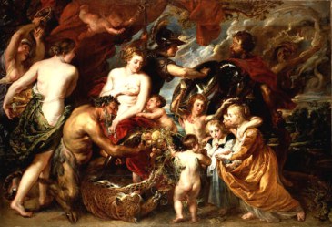 Seine dramatische Bildsprache verband Rubens mit seiner 1623 aufgenommenen diplomatischen Tätigkeit. Bereits 1629 wird er vom spanischen König zum Sekretär des Geheimen Staatsrats der Südlichen Niederlande ernannt und fährt im Juni desselben Jahres nach London, um Friedensverhandlungen zwischen Spanien und England zu führen. Auch mit seiner Kunst setzte er sich aktiv für den Frieden ein und schenkte dem später hingerichteten englischen König Karl I (1600-1649) während den Friedensverhandlungen das kritische auch als Krieg und Frieden bekannte Gemälde Minerva beschützt Pax vor Mars (vor 1630; London, The National Gallery) auf dem die Vorzüge des Friedens und die Folgen des Krieges eindrücklich wiedergegeben sind. Um sein diplomatisches Anliegen zu bekräftigen, malte er während des Dreißigjährigen Krieges (1618-1648) für den Herzog von Toskana das Bild Die Schrecken des Krieges (1638; Florenz, Palazzo Pitti).