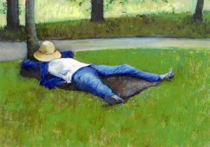Caillebotte kam im Jahr der Französischen Revolution zur Welt und lebte in einer Zeit der gesellschaftlichen Umbrüche, die neue Verfassung, die Industrialisierung, die Verstädterung, der Preußisch-Französische Krieg – es waren turbulente Zeiten, in die er hinein geboren wurde. Von diesen Unruhen ist in seinen Gemälden jedoch nichts zu spüren. Abgesehen von Landschaften malte Caillebotte größtenteils Alltagsszenen, deren darauf abgebildete Personen sich eine kleine Auszeit vom großstädtischen Leben zu gönnen scheinen: Ein Mann ist im Schatten eines Baumes, den Hut über sein Gesicht gezogen, eingeschlafen, ein junger Mann spielt Klavier, Frauen verrichten im Garten sitzend ihre Handarbeiten, andere sind in ihre Lektüre vertieft; auf dem Fluss wird gerudert, auf einem der Boulevards flaniert ein Pärchen im Regen.