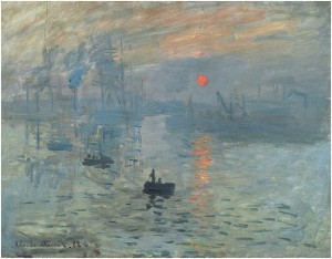 Als Edmond Renoir, Journalist und Bruder des Malers Auguste Renoir (1841-1919), an einem begleitenden Katalog für die erste im Jahr 1874 stattfindende Ausstellung der – wie sie sich selbst nannten – Société anonyme des artistes, peintres, sculpteurs, graveurs (Die Anonyme Gesellschaft der Künstler, Maler, Bildhauer und Grafiker) arbeite, fiel ihm auf, dass Claude Monet (1840-1926) viele seiner Werke einfach mit dem Titel Le Havre versehen hatte. Auf einem dieser Gemälde ist eine diesige, in grau-blaue Nebelschwaden gehüllte morgendliche Flussszenerie dargestellt. Die Umrisse einiger kleiner Paddelboote im Bildvordergrund und größerer im Hafen liegender Segelboote zeichnen sich im Bildhintergrund ab. Der Hafen selbst und die normannische Stadt Le Havre sind im dämmrigen Morgenlicht und aufgrund der dichten Nebelschwaden jedoch nicht zu erkennen. „Schreib Impression“ lautete daher Monets Vorschlag für eine Neubetitelung des Gemäldes, nicht ahnend, dass damit die Bezeichnung der neuen Stilrichtung gefunden war.