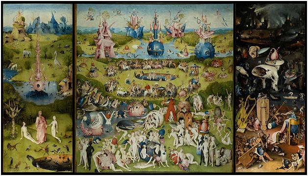 Das Thema des Werkes? Die Geschichte des Sündenfalls: Auf der linken Tafel (der Anfang der Geschichte) führt Gott Adam und Eva im Garten Eden zusammen. Der große Mittelteil zeigt eine einzige wilde Orgie – Menschen bedienen sich ihres freien Willens auf der Suche nach dem ultimativen Genuss. Die rechte Tafel veranschaulicht die Qualen in den Tiefen der Hölle: Als Folge der menschlichen Sündentaten wütet hier Gottes furchtbarer Zorn (heraufbeschworen bereits am Anfang durch die „böse“ Eva).