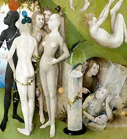 Noch umstrittener ist jedoch sein Einsatz von “haarigen” Figuren (Figuren mit einem braunen Fell) im mittleren Bereich, der nicht selten als ein beabsichtigter Hinweis auf Boschs ketzerische Sichtweise der Evolution interpretiert wurde. Einige Kunsthistoriker wiederum sehen in den harrigen Figuren einfach nur eine gedachte Alternative zu unserem zivilisierten Leben.