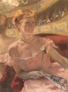 Mary Cassatt, Mujer con collar de perlas en un palco, 1879. Óleo sobre lienzo, 81,3 x 59,7 cm. Philadelphia Museum of Art, Filadelfia