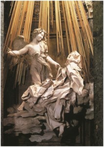 Veía un ángel cabe mí, hacia el lado izquierdo, en forma corporal… Veíale en las manos un dardo de oro largo, y al fin del hierro me parecía tener un poco de fuego. Este me parecía meter por el corazón algunas veces y que me llegaba a las entrañas. Al sacarle, me parecía las llevaba consigo, y me dejaba toda abrasada en amor grande de Dios. Era tan grande el dolor, que me hacía dar aquellos quejidos, y tan excesiva la suavidad que me pone este grandísimo dolor, que no hay desear que se quite, ni se contenta el alma con menos que Dios. No es dolor corporal sino espiritual, aunque no deja de participar el cuerpo algo, y aun harto. Es un requiebro tan suave que pasa entre el alma y Dios, que suplico yo a su bondad lo dé a gustar a quien pensare que miento.
