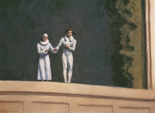 En una de las biografías de Hopper se afirma que se identificaba con la marginalidad de los payasos y otros artistas igualmente ajenos al mundo real. Así, en su última obra, Two Comedians, vistió a su mujer, Josephine, y a sí mismo de pierrots que saludan al público al final de su actuación. Hopper hace una reverencia al espectador y lleva de la mano a aquella que lo acompañó en todo. ¿Qué significa esto? ¿Acaso trataba de decirnos que la soledad que pintaba no era más que metafórica, pues siempre la compartió con Jo? ¿Tal vez es una broma de mi mente solipsista que trata de hacerme entender que el Hopper del que hablo no era más real que este que se despide vestido de comediante?
