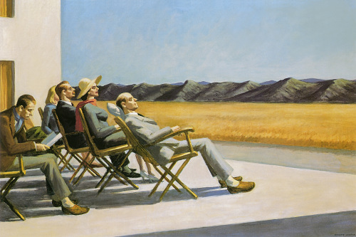En People in the Sun, por ejemplo, vemos a un grupo de personas orgullosas de su propia soledad, con la mirada fija en el horizonte o en una hoja de papel, sin establecer ningún tipo de contacto entre ellos. La absoluta falta de comunicación acentúa la sensación de soledad. Esta obra reúne todos los elementos característicos de Hopper: las grandes formas geométricas, la aplicación de colores planos, la presencia de elementos arquitectónicos y, por supuesto, el protagonismo de la luz, que al proyectar las sombras sobre el pavimento parece ser lo único que tiene movilidad en la composición.