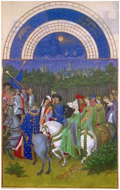 Hermanos Limbourg, El mes de mayo en el calendario de Las muy ricas horas del Duque de Berry, c. 1412-1416. 22,5 x 13,6 cm. Musée Condé, Chantilly.