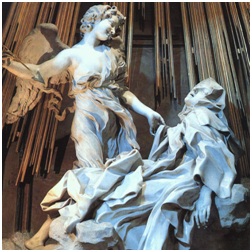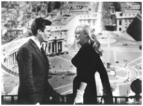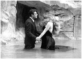 Rome ville diabolique, Rome ville historique et Rome vedette de cinéma. Fellini sera sans aucun doute l’un des premiers la filmer. La Dolce Vita est un éloge de la capitale italienne et Fellini, en y faisant déambuler ses personnages nous en montre les plus beaux recoins, notamment la fontaine de Trevi avec cette célèbre scène que je ne peux m’empêcher de comparer à l’une des œuvres du Bernin. Le Bernin qui était à la sculpture ce que Fellini était au cinéma, c’est-à-dire un artiste aux multiples facettes, doté d’une virtuosité technique incroyable. Ses sculptures majoritairement de thèmes bibliques possèdent un effet dramatique et théâtral. L’expression est parfois caricaturale, tout comme l’était le caractère de certains personnages de Fellini, si bien que l’on en arriverait presque à comparer la Sylvia (Aanita Ekberg) « en extase » de Fellini dans cette fameuse scène, à l’Extase de la sainte Thérèse du Bernin.