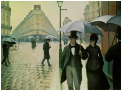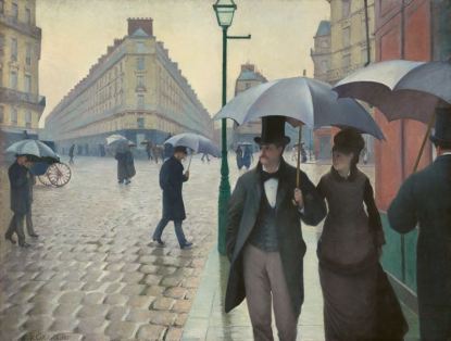 Cependant, contrairement à ses amis impressionnistes, Caillebotte souhaite peindre ce nouveau Paris de manière encore plus réaliste. Le ciel gris, la pluie, les rues pavées de son tableau Rue de Paris, Temps de Pluie, accentuent la sensation de monotonie du quotidien et de tristesse que l’on ressent au premier regard. Pour le peintre, cette nouvelle ville métropolitaine, au plan méticuleux et si esthétique, est comme le quartier des Sims : parfait de l’extérieur, mais seul de l’intérieur.