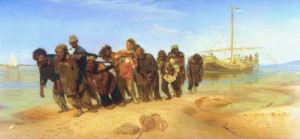 Les Bateliers de la Volga. Des hommes en plein labeur, des cordes nouées autour de leur poitrine, tirent, traînent de lourds bateaux plein de marchandise. Hommes ou bêtes de somme ? Ils avancent imperturbables, les yeux perdus dans le vide, tout à cette tâche qui leur permet de survivre.